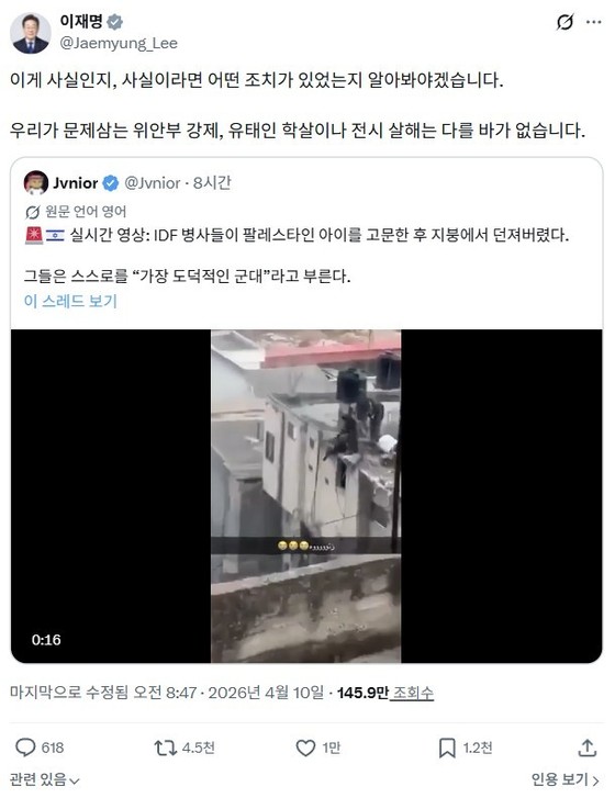 이재명 대통령은 10일 이스라엘군으로 추정되는 인물들의 살해 장면이 담긴 영상을 공유하며 국제인도법과 인권의 보편적 가치를 강조했다.