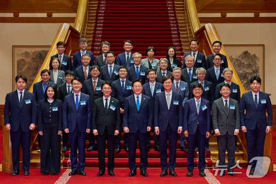 이재명 대통령이 15일 청와대에서 열린 규제합리화위원회 제1차 전체회의에서 참석자들과 기념촬영을 하고 있다. (청와대 제공. 재판매 및 DB 금지) 2026.4.15 © 뉴스1 허경 기자
