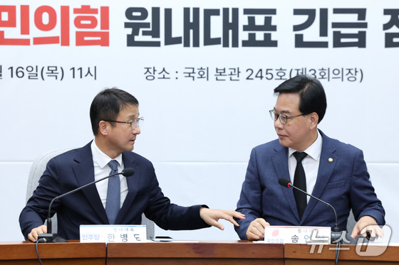 한병도 더불어민주당 원내대표와 송언석 국민의힘 원내대표가 16일 서울 여의도 국회에서 열린 중동 상황 대응·극복을 위한 더불어민주당-국민의힘 원내대표 긴급 점검 회의에서 대화하고 있다. 2026.4.16 © 뉴스1 신웅수 기자