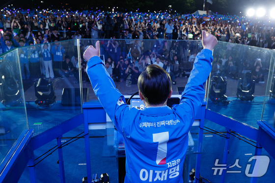 이재명 더불어민주당 대통령 후보가 제21대 대통령선거를 하루 앞둔 2일 오후 서울 영등포구 여의도공원에서 열린 마지막 유세에서 엄지 손을 들고 있다. 2025.6.2 © 뉴스1 안은나 기자