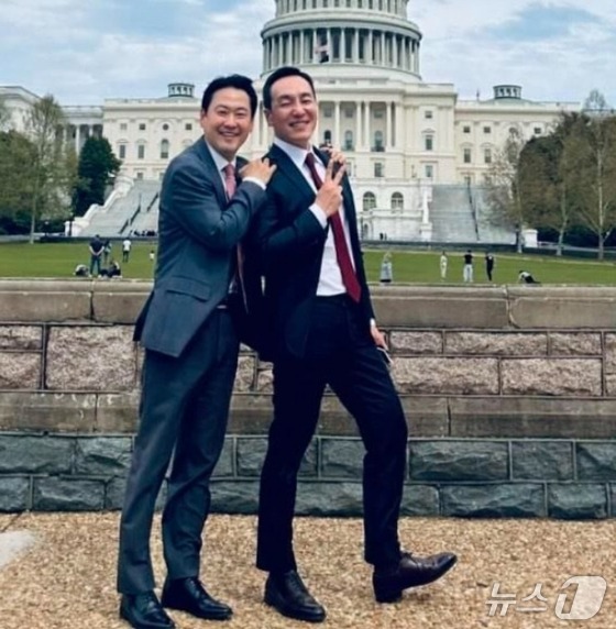 지난 14일(현지시간) 장동혁 국민의힘 대표와 미국 국회의사당을 배경으로 기념사진을 찍은 김민수 최고위원. (SNS 갈무리)© 뉴스1