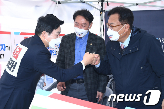 원희룡 국민의힘 대선 경선 후보가 4일 오전 서울 여의도 국회에 설치된 ‘국민의힘 대장동게이트 특검추진 천막투쟁본부’를 방문해 정진석 국회부의장과 주먹 인사를 하고 있다. 가운데 김석기 의원. 2021.11.4 © 뉴스1 오대일 기자