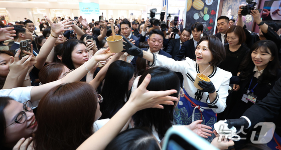 이재명 대통령과 베트남을 방문 중인 김혜경 여사가 23일(현지시간) 하노이 서호 롯데몰에서 열린 K문화관광대전에서 손가락 하트를 만들고 있다. 2026.4.23 © 뉴스1 이재명 기자