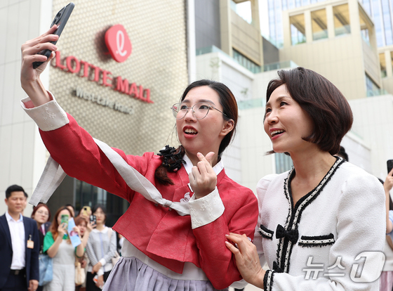 이재명 대통령과 베트남을 방문 중인 김혜경 여사가 23일(현지시간) 하노이 서호 롯데몰에서 열린 K문화관광대전에서 한복을 입은 또우띠 떰씨와 기념촬영을 하고 있다. 2026.4.23 © 뉴스1 이재명 기자