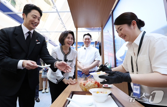 이재명 대통령과 베트남을 국빈 방문 중인 김혜경 여사가 23일(현지시간) 하노이 롯데몰에서 열린 K문화관광대전에서 배우 정일우와 베트남산 과일로 만든 화채를 받고 있다. 2026.4.23 © 뉴스1 이재명 기자