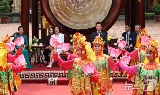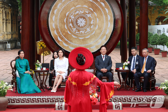 이재명 대통령, 김혜경 여사와 또 럼 베트남 당 서기장 겸 국가주석, 응오 프엉 리 여사가 24일(현지시간) 친교일정으로 베트남 탕롱 황성를 방문해 전통공연을 관람하고 있다. 2026.4.24 © 뉴스1 이재명 기자