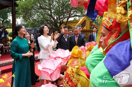 베트남을 국빈 방문중인 이재명 대통령과 김혜경 여사가 24일(현지시간) 하노이 탕롱황성에서 열린 정상 내외간 친교행사에서 또 럼 베트남 공산당 서기장과 부인 응오 프엉 리 여사와 전통공연 관람을 마치고 공연단을 격려하고 있다. 2026.4.24 © 뉴스1 이재명 기자