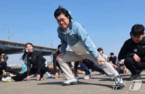 정원오 더불어민주당 서울시장 후보가 25일 오전 서울 서초구 반포한강공원에서 열린 '찾아가는 현장: 러닝편'에서 러닝 동호회원들과 준비운동을 하고 있다. 2026.4.25 © 뉴스1 오대일 기자