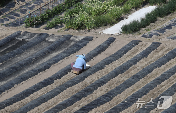 23일 대구 수성구 들녘에서 한 농민이 보온용 비닐을 덮어둔 밭을 손질하며 농사를 준비하고 있다. 중동 사태 이후 비닐 가격이 올라 올해 농사를 준비하는 농민의 마음은 무겁기만 하다. 2026.4.23 © 뉴스1 공정식 기자