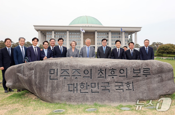 문재인 전 대통령과 김정숙 여사가 4.27 판문점선언 8주년 기념식 참석차 27일 국회를 방문해 '민주주의 최후의 보루 대한민국 국회' 문구가 새겨진 상징석 앞에서 우원식 국회의장과 정동영 통일부 장관, 김민기 국회사무총장, 더불어민주당 의원들과 기념촬영하고 있다. (공동취재) 2026.4.27 © 뉴스1 김도우 기자