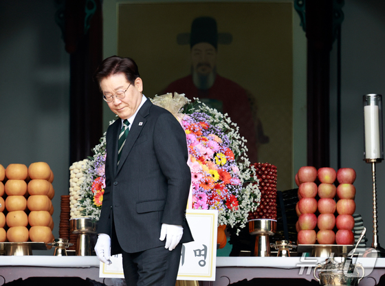 이재명 대통령이 28일 충남 아산시 현충사에서 열린 충무공 탄신 제481주년 기념행사에서 헌화를 마친 뒤 자리로 향하고 있다. 2026.4.28 © 뉴스1 이재명 기자