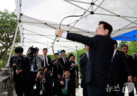 이재명 대통령이 28일 충남 아산시 현충사에서 열린 제65회 대통령기 전국 궁도대회에서 활시위를 당기고 있다. 2026.4.28 © 뉴스1 이재명 기자