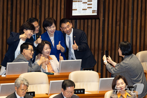 추미애 더불어민주당 경기도지사 후보와 의원들이 28일 서울 여의도 국회에서 열린 제434회 국회(임시회) 제8차 본회의에서 기념 촬영을 하고 있다. 2026.4.28 © 뉴스1 유승관 기자