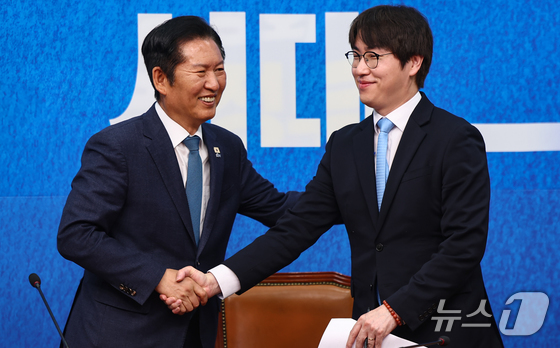 정청래 더불어민주당 대표가 29일 서울 여의도 국회에서 열린 더불어민주당 인재영입식에서 하정우 전 청와대 AI미래기획수석과 인사를 나누고 있다. © 뉴스1 김도우 기자