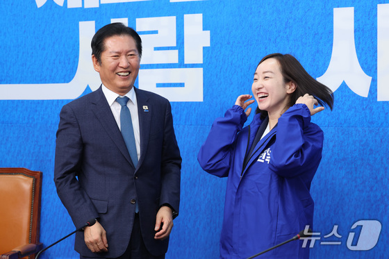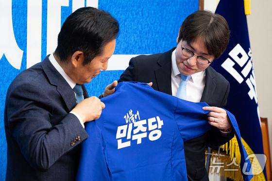 정청래 더불어민주당 대표가 29일 서울 여의도 국회에서 열린 민주당 인재 영입식에서 전은수 전 청와대 대변인에게 당 점퍼를 입혀주고 있다. 2026.4.29 © 뉴스1 신웅수 기자