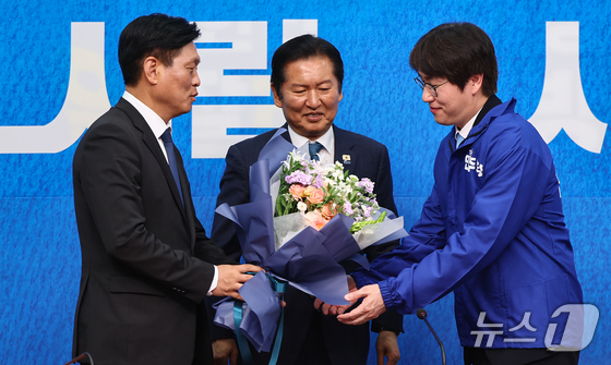 하정우 전 청와대 AI미래기획수석이 29일 서울 여의도 국회에서 열린 더불어민주당 인재영입식에서 조승래 사무총장에게 꽃다발을 전달받고 정청래 더불어민주당 대표와 기념촬영을 하고 있다. © 뉴스1 김도우 기자