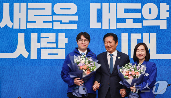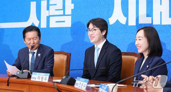 정청래 더불어민주당 대표가 29일 서울 여의도 국회에서 열린 더불어민주당 인재영입식에서 하정우 전 청와대 AI미래기획수석, 전은수 전 청와대 대변인과 기념촬영을 하고 있다. 2026.4.29 © 뉴스1 김도우 기자