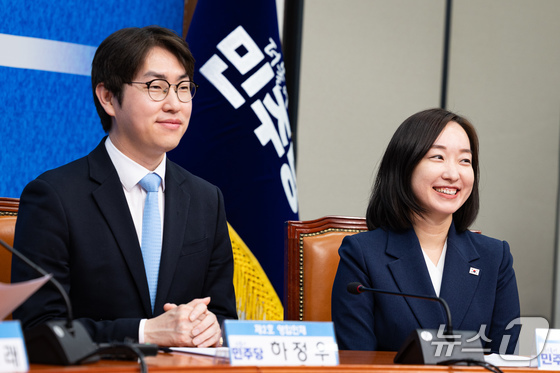 더불어민주당 6.3 지방선거 인재영입 2호 하정우 전 청와대 AI미래기획수석과 발탁인재 전은수 전 청와대 대변인이 29일 서울 여의도 국회에서 열린 제2차 인재영입식에서 미소 짓고 있다. 하정우 전 수석은 전재수 의원이 당 부산시장 후보로 선출되면서 공석이 된 부산 북구갑 지역구에, 전은수 전 대변인은 강훈식 대통령 비서실장의 지역구였던 충남 아산을에 출마할 전망이다. © 뉴스1 유승관 기자
