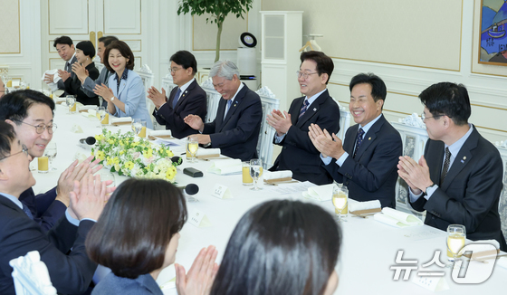 이재명 대통령이 29일 청와대에서 열린 비교섭단체 및 무소속 국회의원 초청 오찬 간담회에서 참석 의원들과 박수를 치고 있다. (청와대통신사진기자단) 2026.4.29 © 뉴스1 이재명 기자