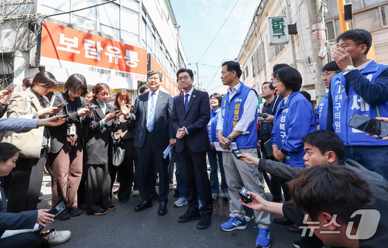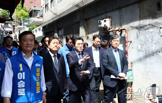 정원오 더불어민주당 서울시장 후보가 29일 오전 서울 성북구 장위14 주택 재개발 구역을 찾아 부동산 공약 발표를 앞두고 현장을 점검하고 있다. 2026.4.29 © 뉴스1 최지환 기자