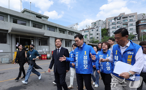 정원오 더불어민주당 서울시장 후보가 29일 서울 성북구 정릉공영차고지에서 열린 '찾아가는 현장: 정릉차고지편'에서 차고지 부지를 둘러보고 있다. 2026.4.29 © 뉴스1 김성진 기자