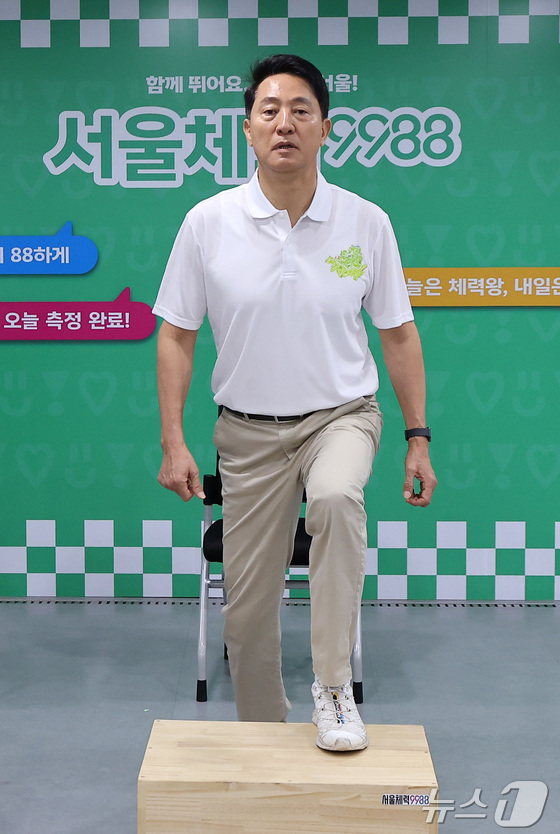 오세훈 국민의힘 서울시장 후보가 29일 서울 도봉구 도봉구보건소에 마련된 서울체력9988 도봉센터에서 1호 공약 '강철 체력, 활력 서울'을 발표한 후 체력 측정을 하고 있다. 2026.4.29 © 뉴스1 김성진 기자