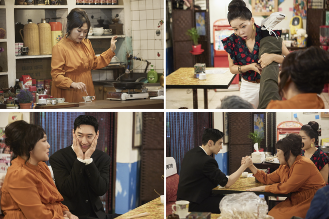 1회에서는 오늘의 메뉴 ‘쌍화탕’을 중심으로 자매의 좌충우돌 영업기가 펼쳐졌다. 첫 손님 김의성은 쌍화탕을 주문하자마자 정이랑의 괄사 마사지를 얼떨결에 받았고, 이어 ‘더티 커피’를 주문했다가 진짜 ‘더러운 커피’를 받아 경악한 표예진은 결국 쌍화차로 메뉴를 변경했다. 두 사람 모두 '자매다방'의 사훈 ‘한 잔에 손맛과 정성을 담아’를 온몸으로 체험했다. 이제훈과 이수지의 팔씨름 대결은 이날의 하이라이트. 패배 후 쌍화차 두 잔과 애교 3종 세트를 선보인 이제훈 덕분에 분위기는 한층 달아올랐다. 이어 이수지는 시낭송까지 선보이며 특급 서비스를 이어갔고, 표예진과의 삼각구도가 형성되면서 다방은 웃음바다로 변했다.