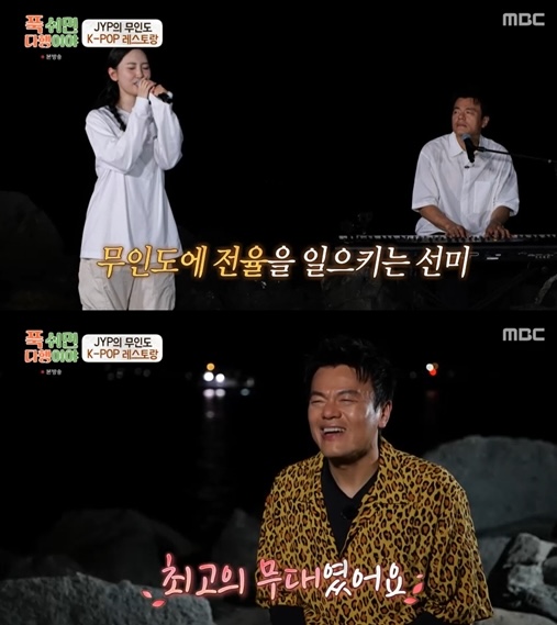 지난 17일 방송된 MBC '푹 쉬면 다행이야'(이하 ‘푹다행’)에서는 박진영과 그룹 god의 박준형, 손호영, 김태우, 가수 선미가 함께한 무인도 레스토랑 운영기와 달빛 아래 콘서트가 펼쳐졌다.