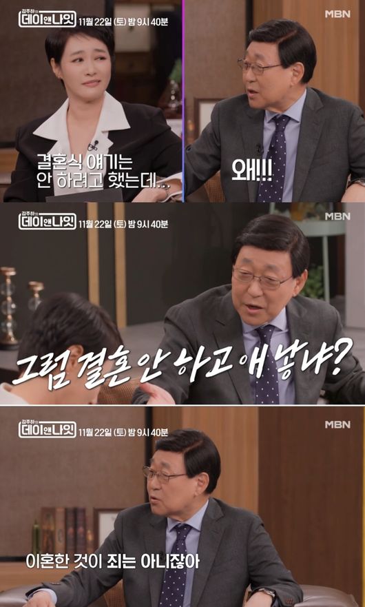 이날 방송에는 김동건 아나운서가 게스트로 출연해 이야기를 나눴다. 김주하는 "제가 그 뒤로 결혼하고 애기를 낳았는데 돌잔치도 다 오셨다"라고 오랜 인연을 전했고, 김동건은 "결혼식에도 가고 돌잔치에도 갔다"라고 솔직하게 말했다.