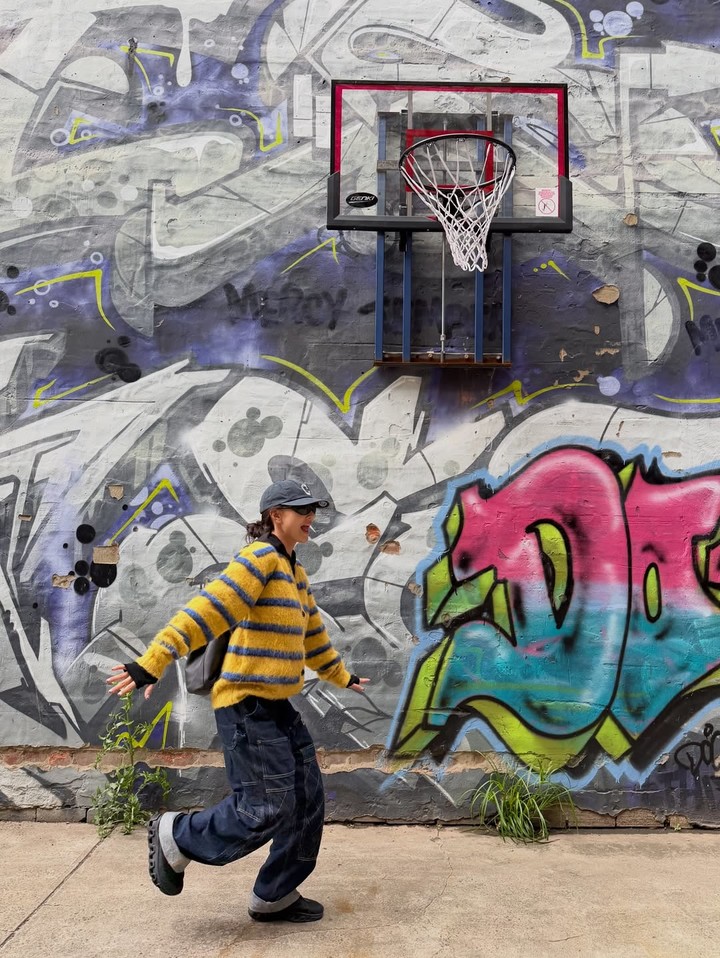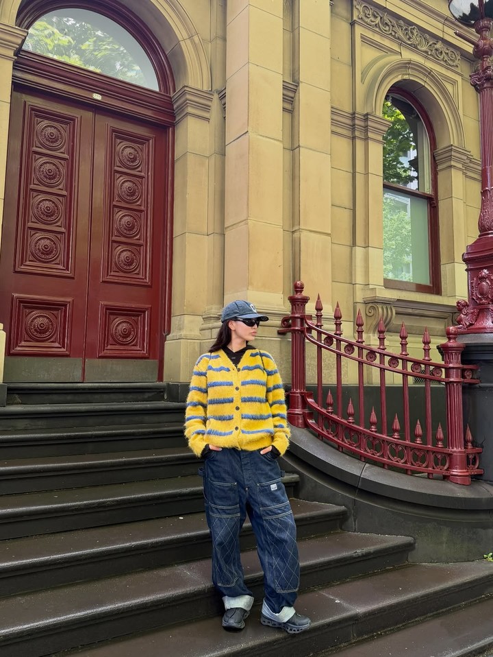 또 다른 컷에서는 옐로 스트라이프 가디건에 워크웨어형 포켓 디테일 데님, 투박한 러그솔 슈즈를 조합해 ‘고프코어+Y2K’ 무드를 구현했다.