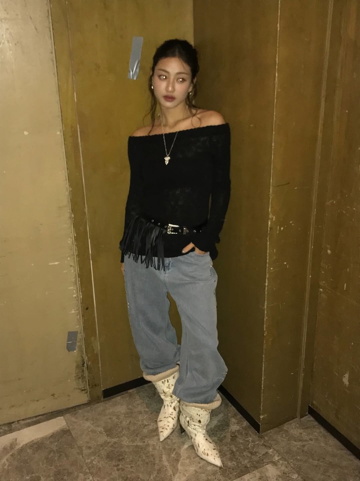 또 다른 이브닝 무드의 사진에서는 오프숄더 니트에 화이트 색상의 퍼 웨스턴 부츠를 매치해 상체를 미니멀, 하체를 포인트로 배분한 시선 분산 코디를 선보였다.