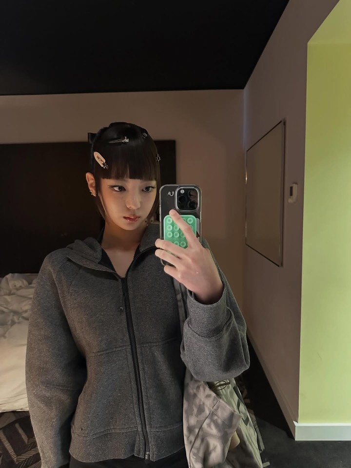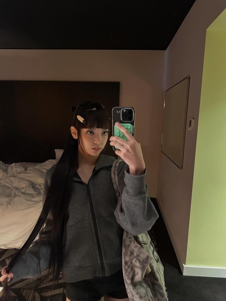 또렷한 ‘처피뱅 앞머리’에 컬러 미니 집게핀을 더해 Y2K 감성을 살렸고, 거울에 비친 전신샷에서는 긴 포니테일이 허리 아래로 떨어지며 ‘롱헤어’의 존재감을 드러냈다.