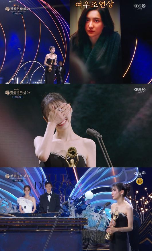 이날 이상희와 강태오의 기합 속에 발표된 여우조연상은 ‘히든페이스’의 박지현에게 돌아갔다. ‘어쩔수가없다’의 염혜란, ‘얼굴’의 신현빈, ‘검은수녀들’의 전여빈, ‘좀비딸’의 이정은 등 쟁쟁한 선배 연기자들을 제친 수상이었던 만큼 박지현은 수사을 전혀 예상하지 못했던 듯 감격하며 입을 다물지 못했다.