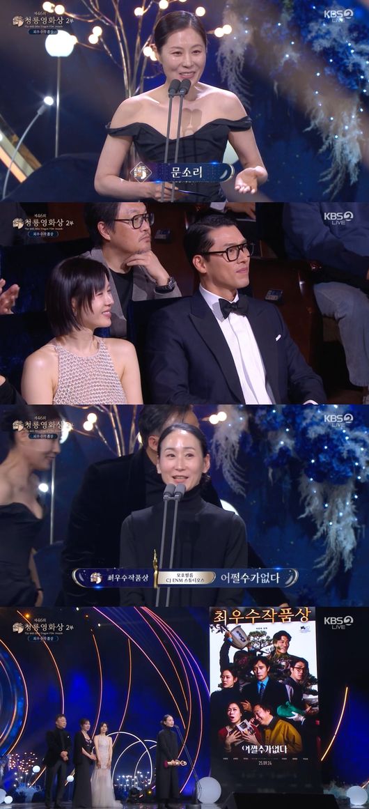 이에 제작사 모호필름의 박지선은 "많은 분들이 아시다시피 박찬욱 감독님이 ‘어쩔수가없다’를 만들기까지 20년이 걸렸다. 망설임 없이 이 작품에 투자해준 CJ 및 관계자 분들께 감사하다. 늘 그렇듯 현장에서 아끼지 않는 배우, 스태프 분들께 감사하다. 현장에서 매번 든든한 지원군임을 느끼게 된다. 영화의 완성은 관객 분들이다. 이 영화를 봐주신 관객 분들께 진심으로 감사하다"라며 "시상자 문소리 선배님 말씀처럼 업계가 많이 위축된 것 같은데 20년 만에 만들어진 이 영화를 보고 많은 분들이 힘을 얻으셨으면 좋겠다"라고 작품을 대표해 소감을 밝혔다.