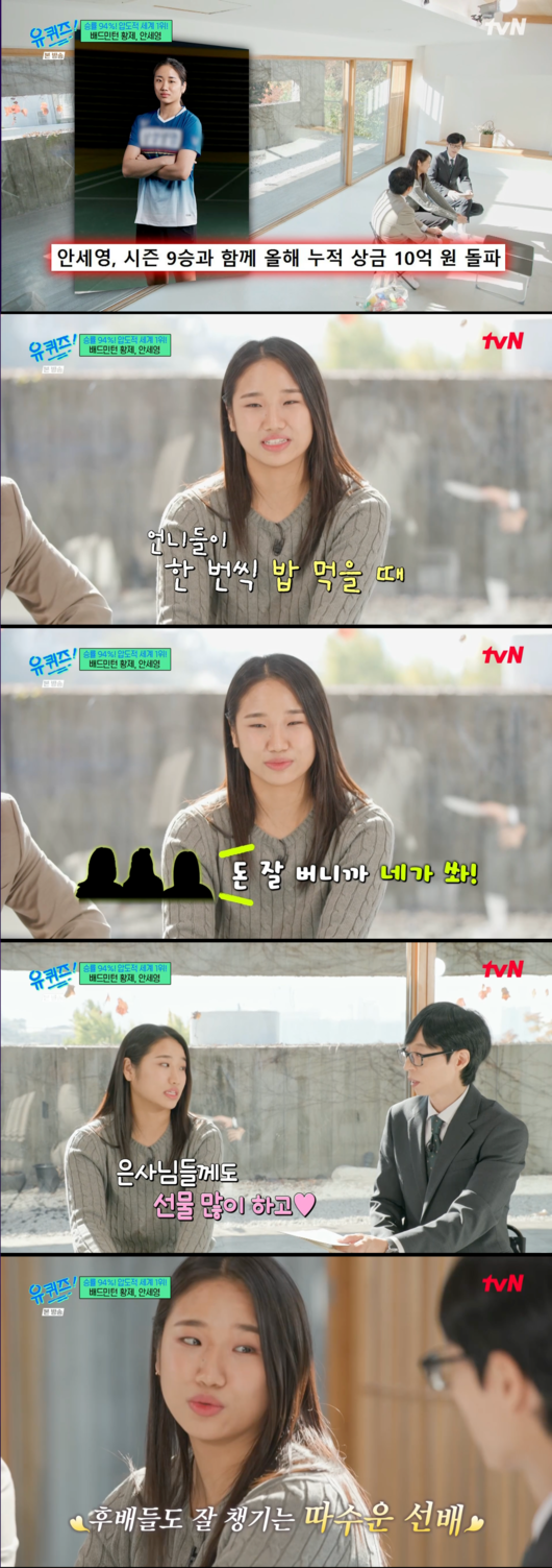 [OSEN=박근희 기자] '유 퀴즈 온 더 블럭’ 배드민턴 여자 단식 세계 랭킹 1위 안세영이 누적 상금 10억 원 돌파 후의 통 큰 'FLEX(플렉스)' 미담을 공개했다.