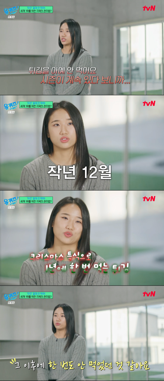이어 튀김에 대한 질문에 "튀김을 아예 안 먹는다. 시즌이 계속 있다 보니까"라고 말하며, "연말에 조금 시간 있다 보니까. 그때 딱 한 번 먹고. 작년 크리스마스 때 먹고 그 이후에 한 번도 안 먹었던 것 같다"고 전해 1년 가까이 튀김을 철저히 금하고 있는 극한의 자기 통제력을 공개했다.