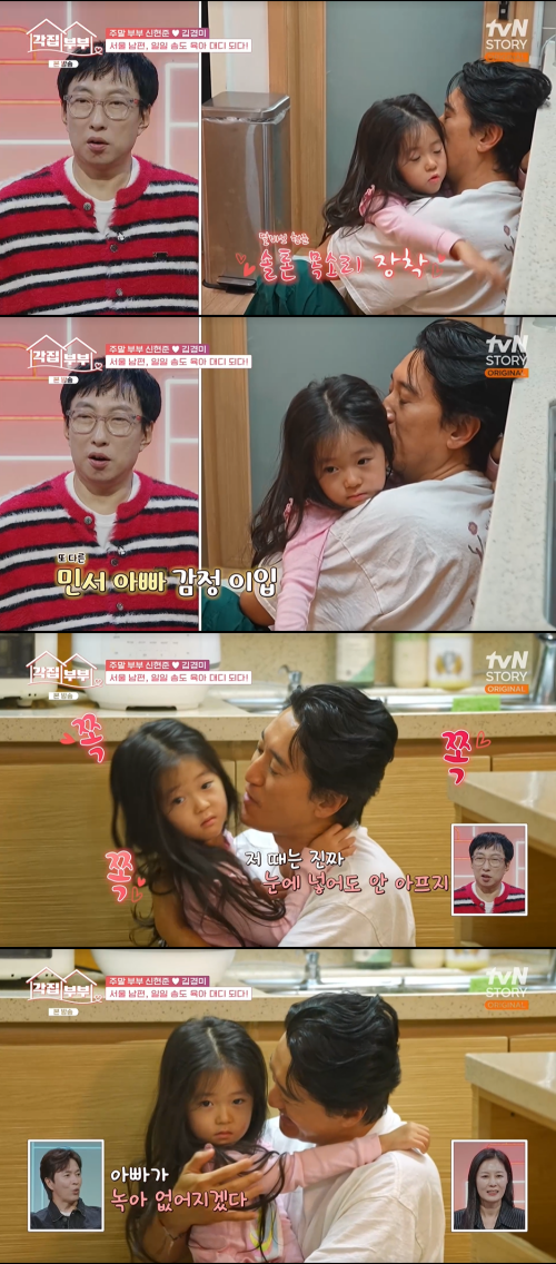 민서가 밥을 달라고 조르자, 신현준은 "밥 지금 만들어 먹을까? 뽀뽀 한번 해줄래?"라며 애정 가득한 '뽀뽀 교환'을 시도하는 등 사랑스러운 부녀의 일상을 공개했다.