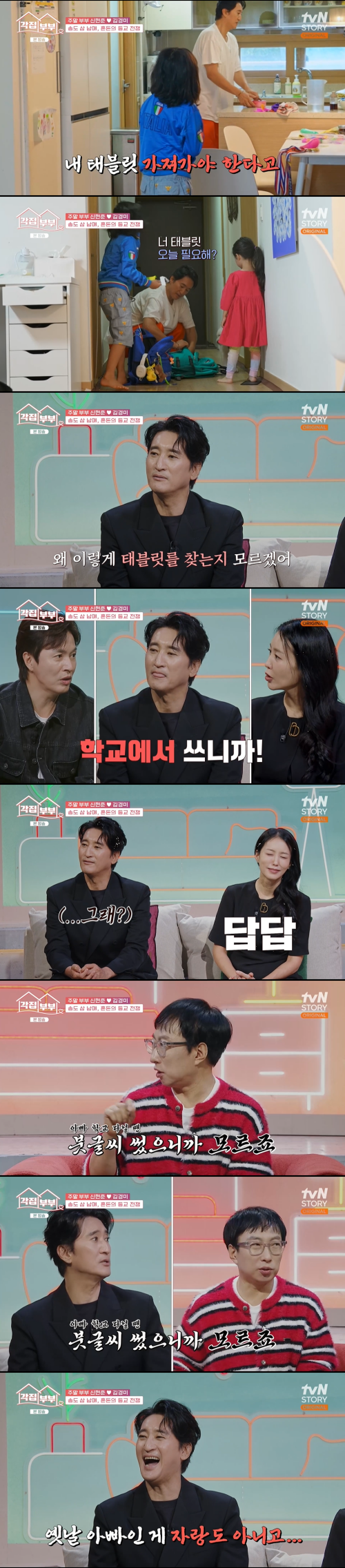 스튜디오에서 이 모습을 지켜보던 신현준은 "왜 이렇게 태블릿을 찾는지 모르겠다"며 요즘 아이들의 등교 문화에 대한 이해 부족을 드러냈다. 이에 패널로 있던 와이프 김경미와 김정민은 즉시 "하교에서 써요"라고 '칼답'하며 태블릿의 사용 용도를 설명했다.
