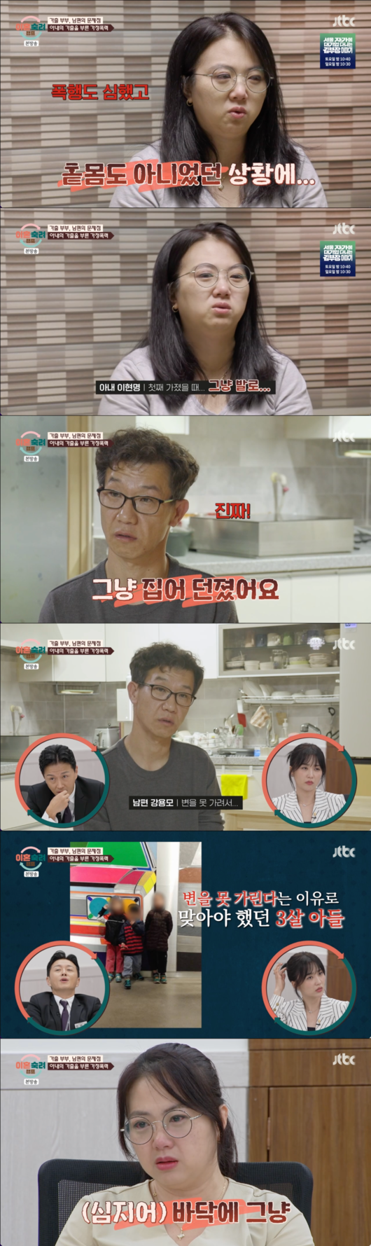 아내는 첫째를 임신했을 당시를 떠올리며 "첫째 가졌을 때 그냥 발로 (찼다)"라고 말해 충격을 안겼다. 아내는 결혼 이후 폭력 수위가 더욱 강해졌다고 호소했다.