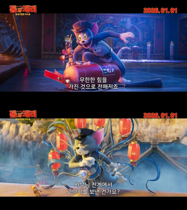 소용돌이에 휘말린 톰과 제리는 순식간에 동양의 고대 도시로 차원 이동하게 되고, “사부님 천계에서 고양이를 보낸 건가요?”, “냥신님이 계셔서 특별한 날이 되겠군요” 와 같은 유쾌한 대사가 이어지며 고대 세계에서의 파란만장한 여정을 암시한다.