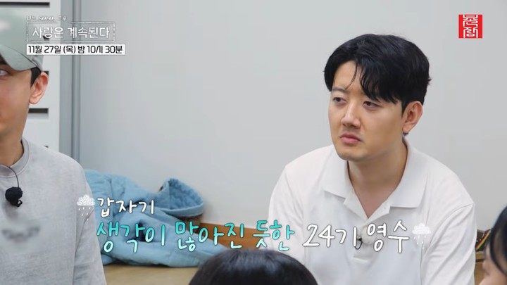 얼마 후, 18기 영철과 튤립도 데이트 후 숙소로 돌아왔고, 화기애애한 두 사람의 모습에 24기 영수는 표정이 굳어졌다.