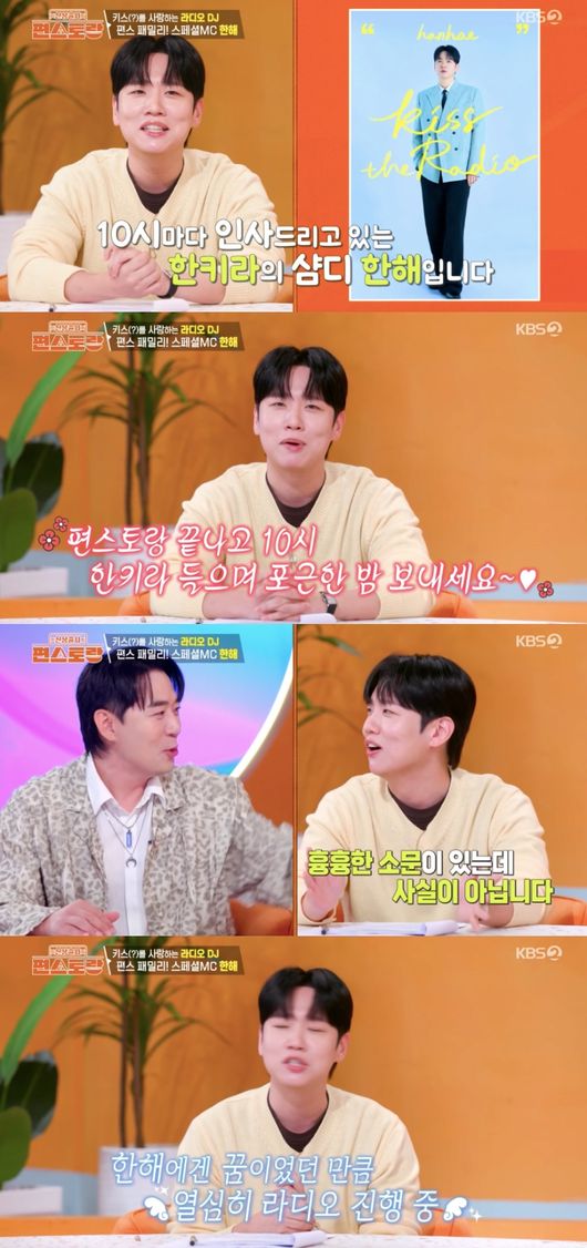 한해는 “이런 흉흉한 소문이 있는데 전혀 사실이 아니고요”라고 해명하며, “워낙 꿈이었던 라디오 DJ를, 버킷리스트를 이루어간다는 마음으로 하고 있다”라고 전했다.