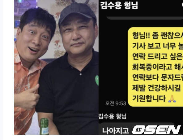 개그맨 허동환 역시 SNS를 통해 김수용과 나눈 메시지를 공개하며“기사 보고 많이 놀랐다. 소중한 사람 또 잃는 줄 알았다”라며 진심 어린 걱정을 전했다. 그는 “형님!! 좀 괜찮으세요?기사 보고 너무 놀라 문자 드립니다.제발 건강하시길 기원합니다”라고 적었고,김수용은 짧지만 “나아지고 있어 고마워”라며 직접 근황을 알려 모두를 안심시켰다.