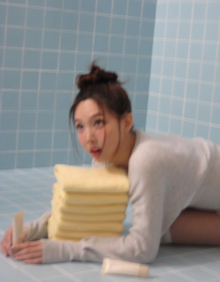 또 다른 컷에서는 하늘색 타일 배경 위에 크림 톤의 의상을 맞춰 입고, 노란 타월 더미에 기대 누운 포즈로 몽환적인 분위기를 자아낸다.