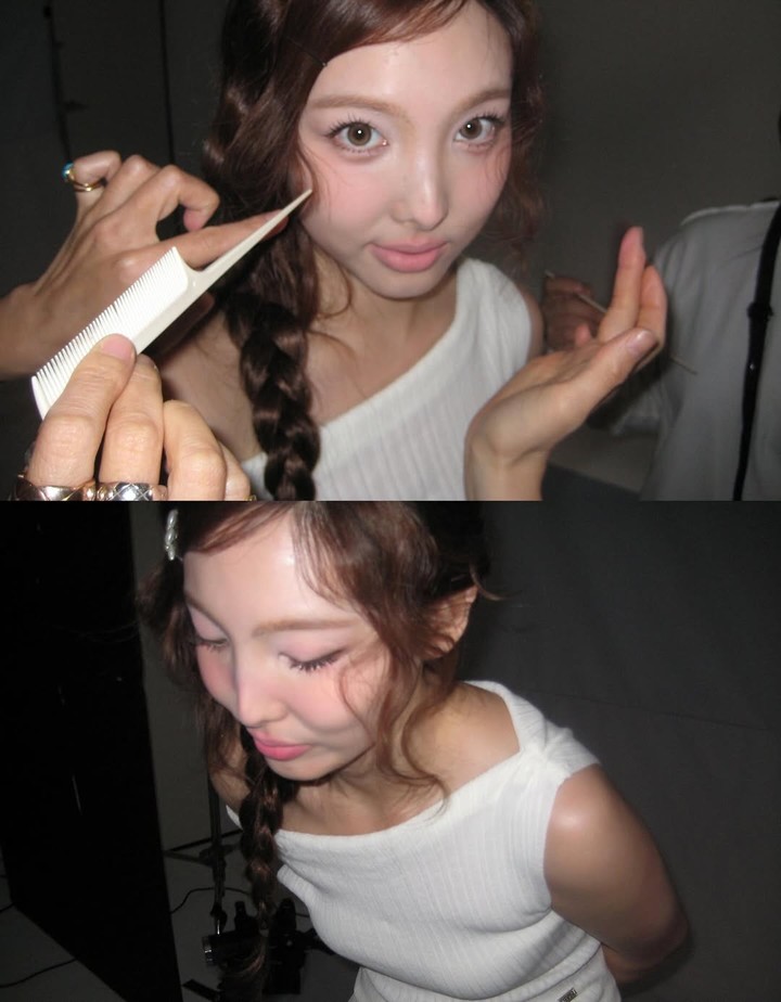 지난 20일 나연은 자신의 SNS에 뷰티 브랜드 '퓌'(fwee)를 태그하며 여러 장의 사진을 게재했다. 공개된 사진 속 나연은 화이트 슬리브리스 톱에 땋은 머리를 연출한 채, 메이크업 아티스트의 손길을 받으며 미소 짓고 있다.