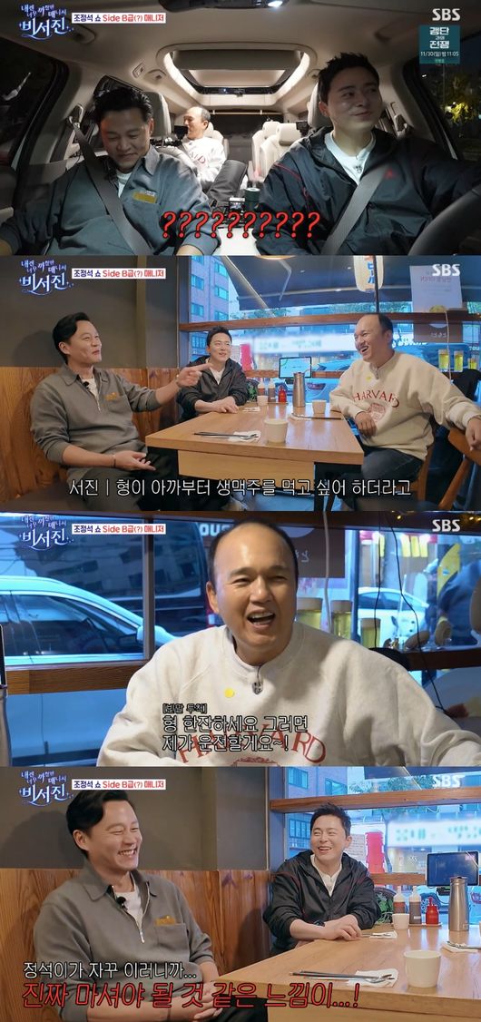 이서진은 “이 형 오늘 미쳤네”라면서도 “형 혼자 또 어떻게 먹냐”라고 해 폭소케 했다. 고민 끝에 두 사람은 생맥주 2잔을 주문했고, 조정석은 “와 진짜 결제가 되고 있네. 재밌네. ‘비서진’ 정말 재밌네. 사상 최초로”라며 황당해했다.