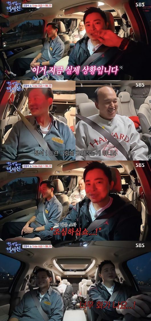 결국 운전대를 잡고 역수발을 하게 된 조정석은 카메라를 향해 “이거 실제상황이다. 재미를 일부러 유발하기 위해 이런 그림을 그린 건 아니다. ‘비서진’ 이 형들 정말 미친 것 같다”라고 울화통을 터트렸다.