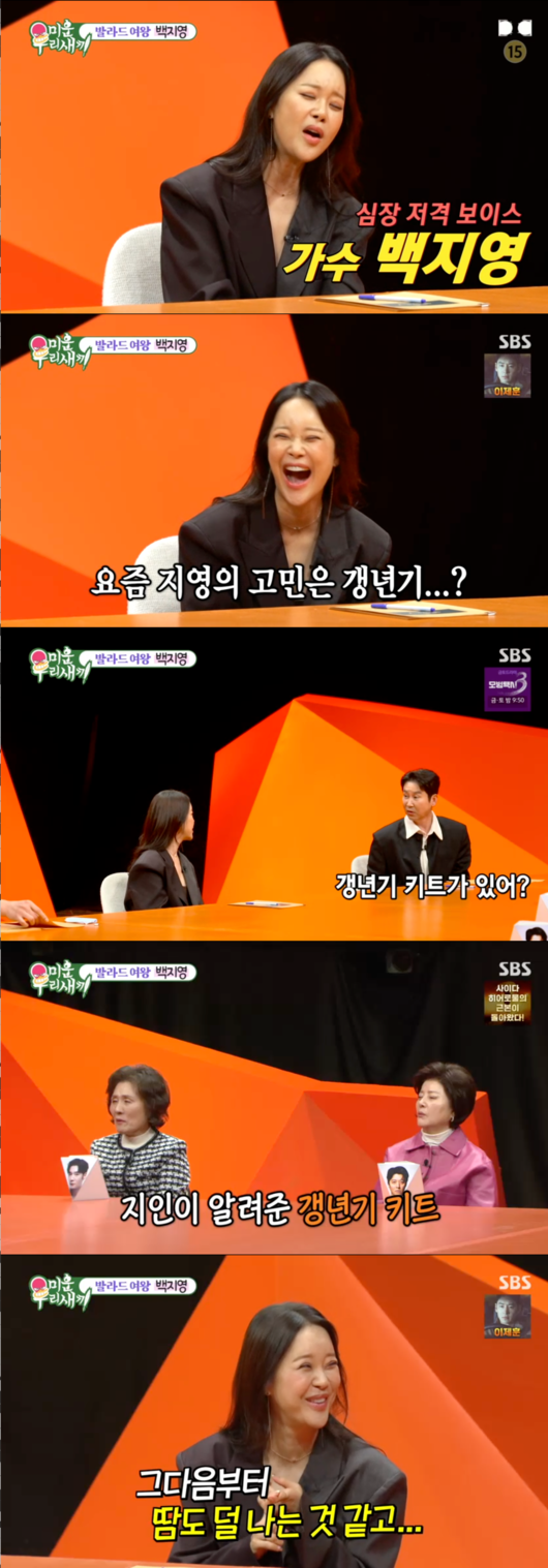백지영은 "자그마한 일에 자꾸 예민해지고 피로도도 심하다"며 갱년기 증상에 대한 고민을 털어놨다. 그녀는 자신의 나이를 언급하며 "76년생이다. 제 나이 때쯤 되면 갱년기를 걱정할 때다"라고 공감대를 형성했다.