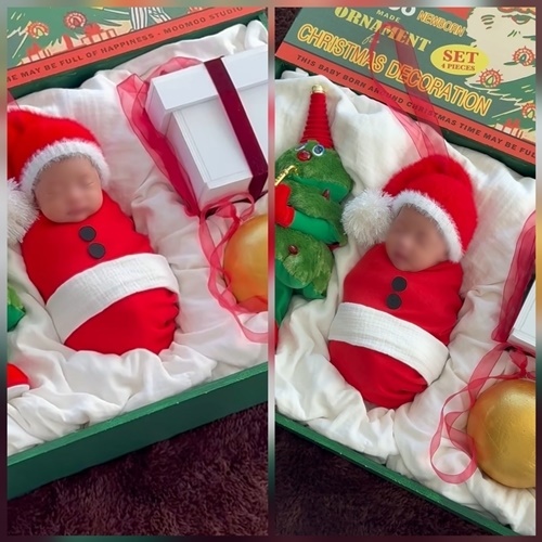생후 17일 된 둘째 딸을 크리스마스 선물로 꾸민 콘셉트의 화보 촬영이었다. 산타 복장을 한 딸이 소품과 함께 나란히 상자에 담겨 눈길을 끌었다.