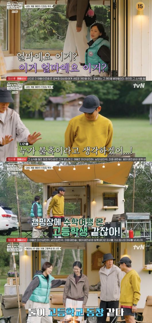 장나라는 집을 소개시켜줬고, 류혜영의 격한 반응에 “우리 집보다 예쁜 것 같다”라며 흐뭇해했다. 구석구석 살피던 류혜영은 “잘 만들었다. 에어컨도 달고”라면서도 “얼마예요 이거?”라며 관심을 드러냈다. 이에 김희원은 “집 안 팔아”라고 했고, 성동일도 “비매품”이라고 단호하게 답해 웃음을 자아냈다.